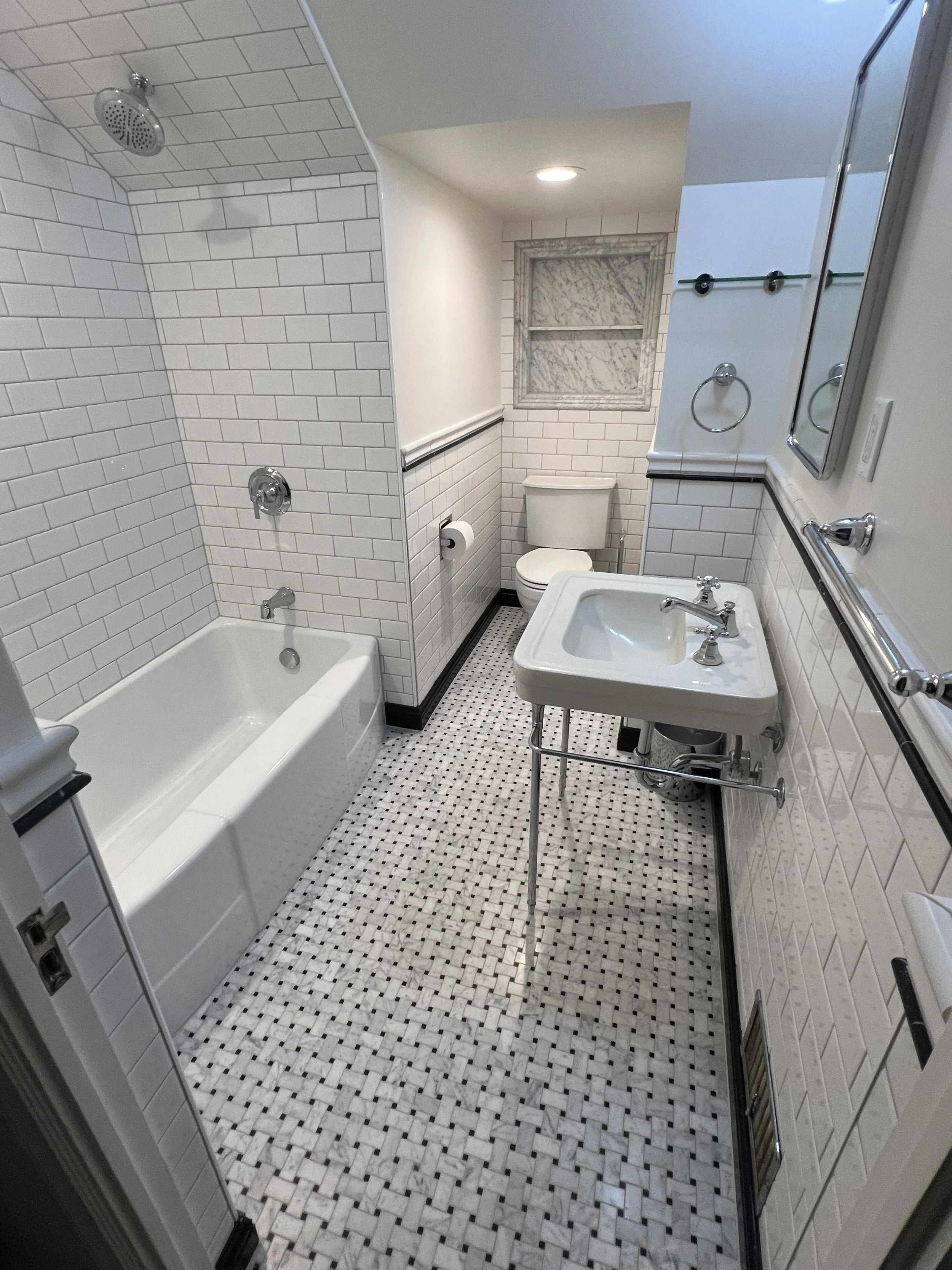 This beautiful bathroom with marble floor tile and shower niches was designed by the homeowner. They have fantastic taste! Windermere neighborhood Seattle, Wa.